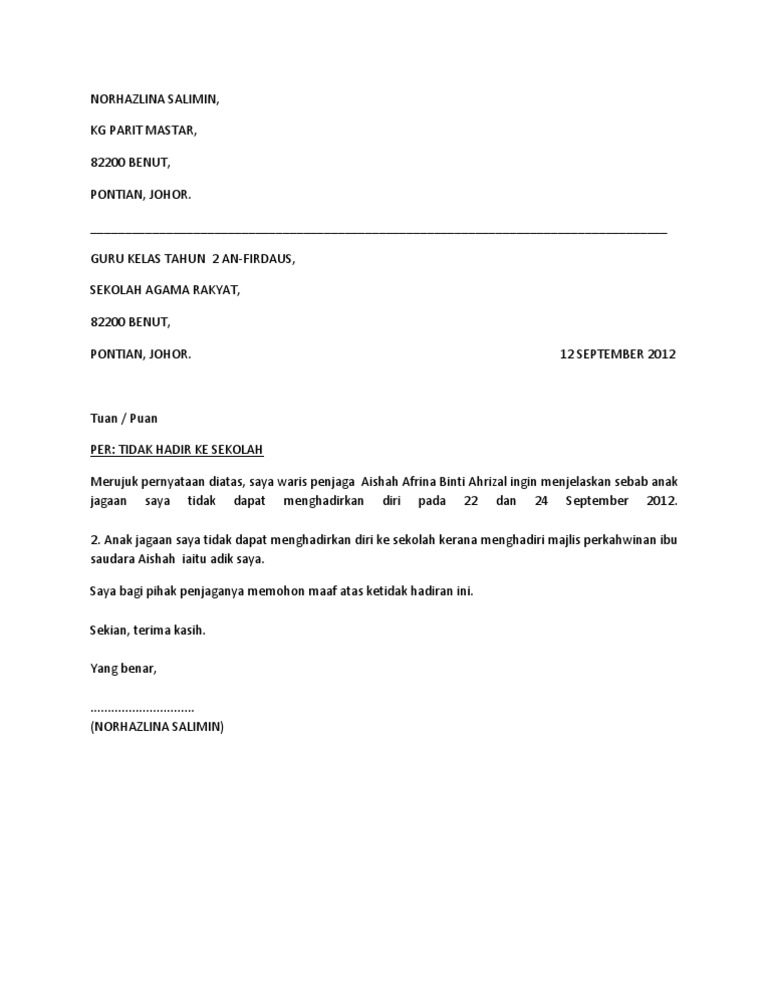 Surat Tidak Hadir Ke Sekolah Urusan Keluarga Petaling Jaya Selangor. Pernyataan tertulis dari kepala sekolah ini bisa untuk guru ataupun siswa tentunya untuk suatu keperluan dari objek yang dinyatakan. 2Anak jagaan saya tidak dapat menghadirkan diri ke sekolah disebabkan mengalami demam yang bermula setelah.